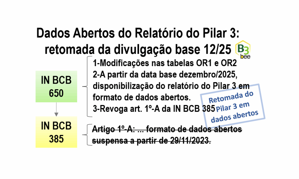 Instituições financeiras, a disponibilização do relatório do Pilar 3 será retomada a partir da data base de dezembro/2025, conforme a IN BCB 650/25, que altera a IN BCB 385/23, também ajustando as tabelas OR1 e OR2 recém-incluídas.