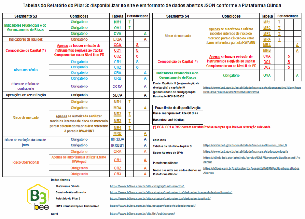 Resolução BCB 54/20 da divulgação do Relatório do Pilar 3 (tabelas, periodicidade, segmentação): https://www.bcb.gov.br/estabilidadefinanceira/exibenormativo?tipo=Resolu%C3%A7%C3%A3o%20BCB&numero=54
